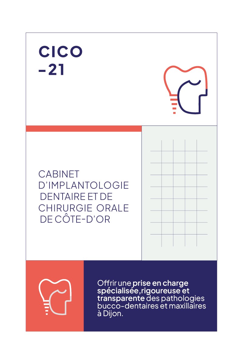 Création de l’identité visuelle du cabinet CICO-21, spécialisé en implantologie dentaire et en chirurgie orale à Dijon. Un univers graphique lumineux, précis et rassurant, conçu pour incarner le sérieux et la modernité du futur cabinet.
