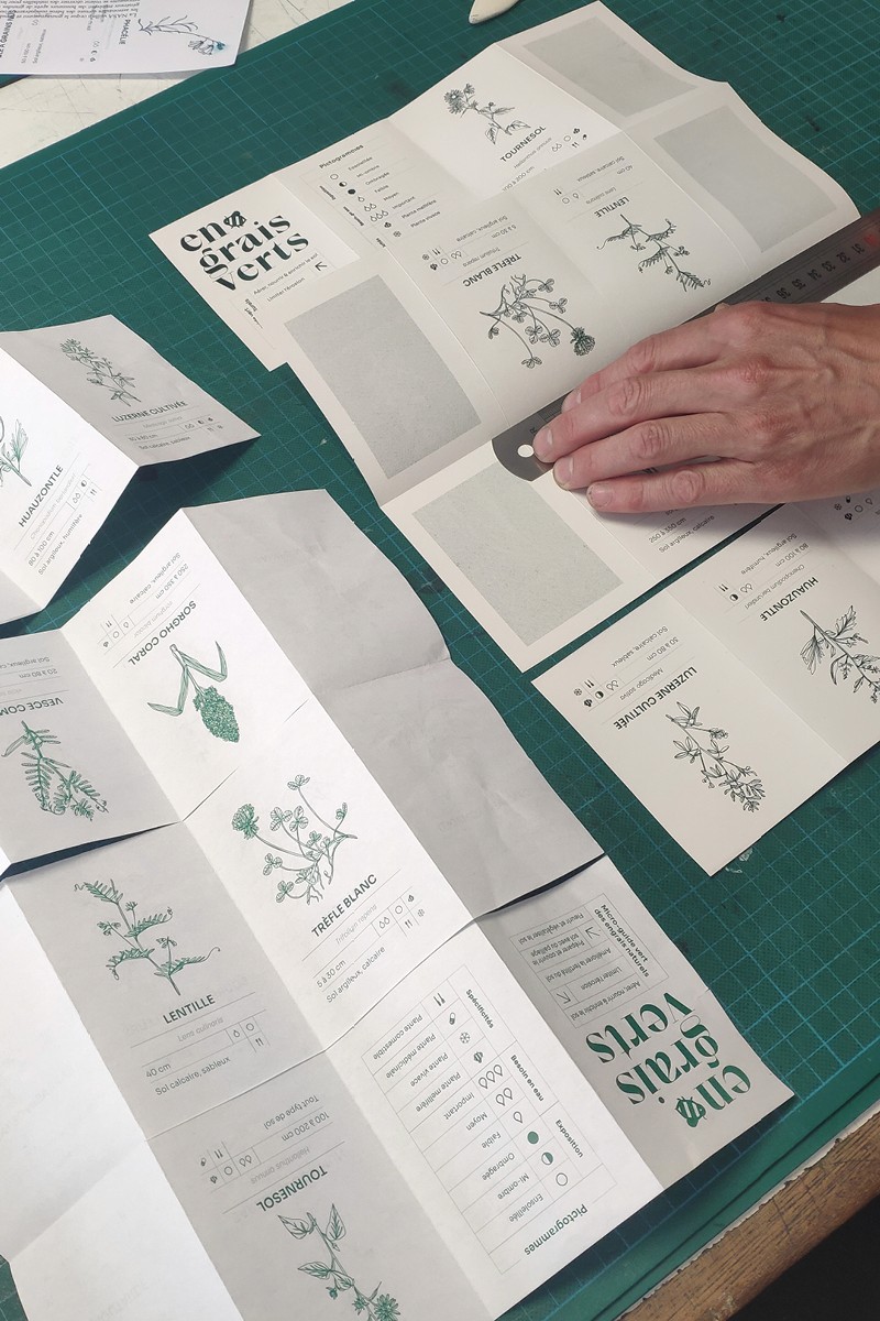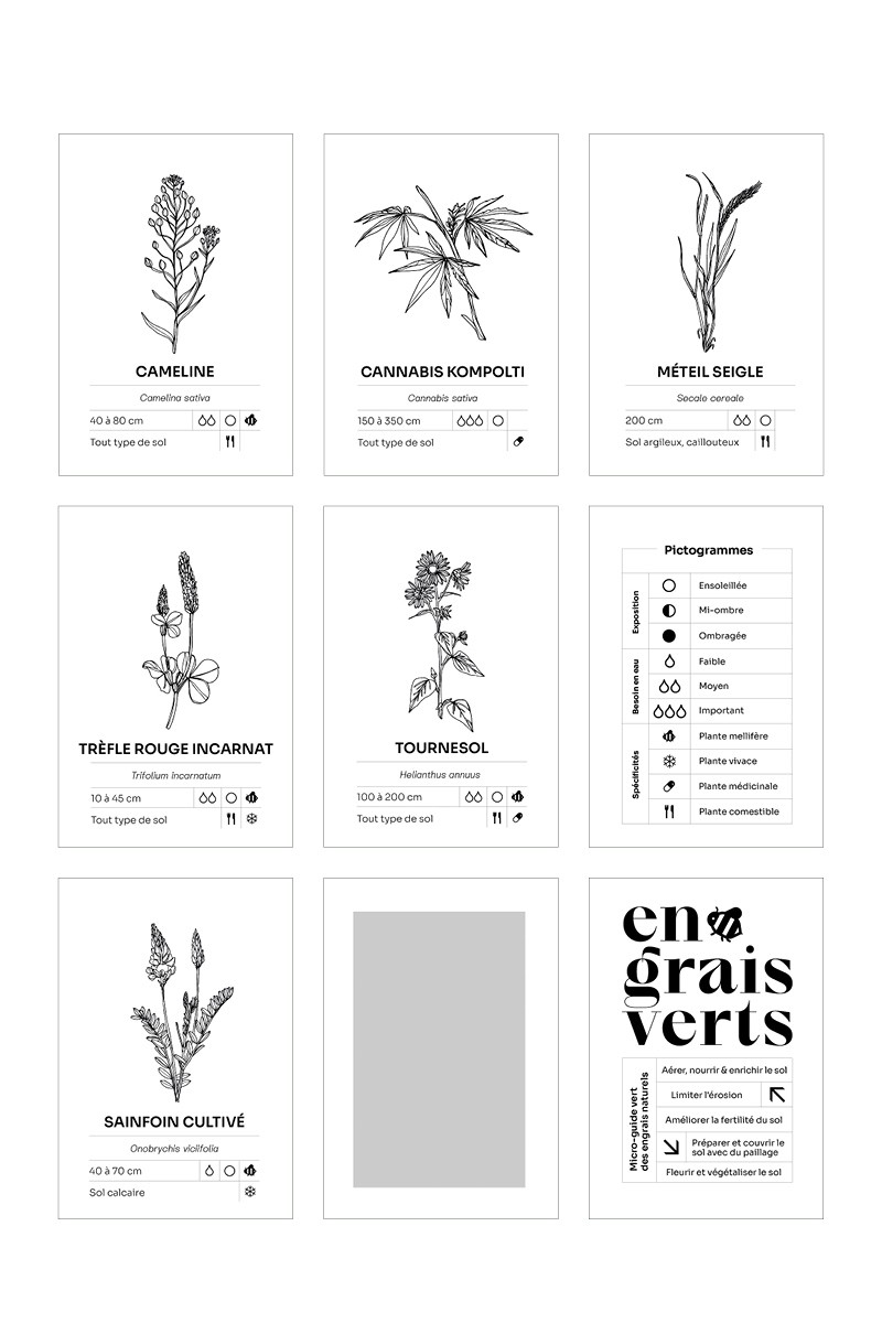 Illustration, mise en page et éco-conception d’une micro-édition sur le thème des engrais naturels selon les références des semences de l'association Kokopelli. Tirage unique imprimé en risographie édité à 50 exemplaires, façonnés à la main.