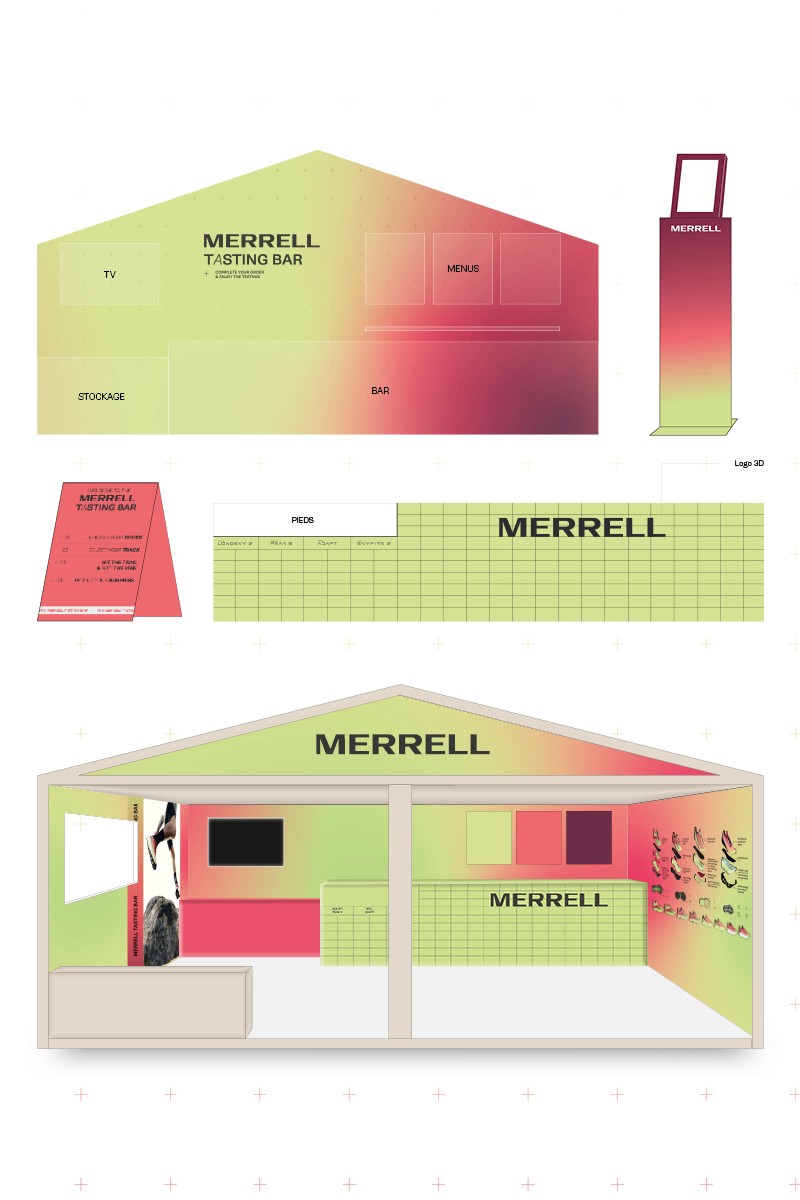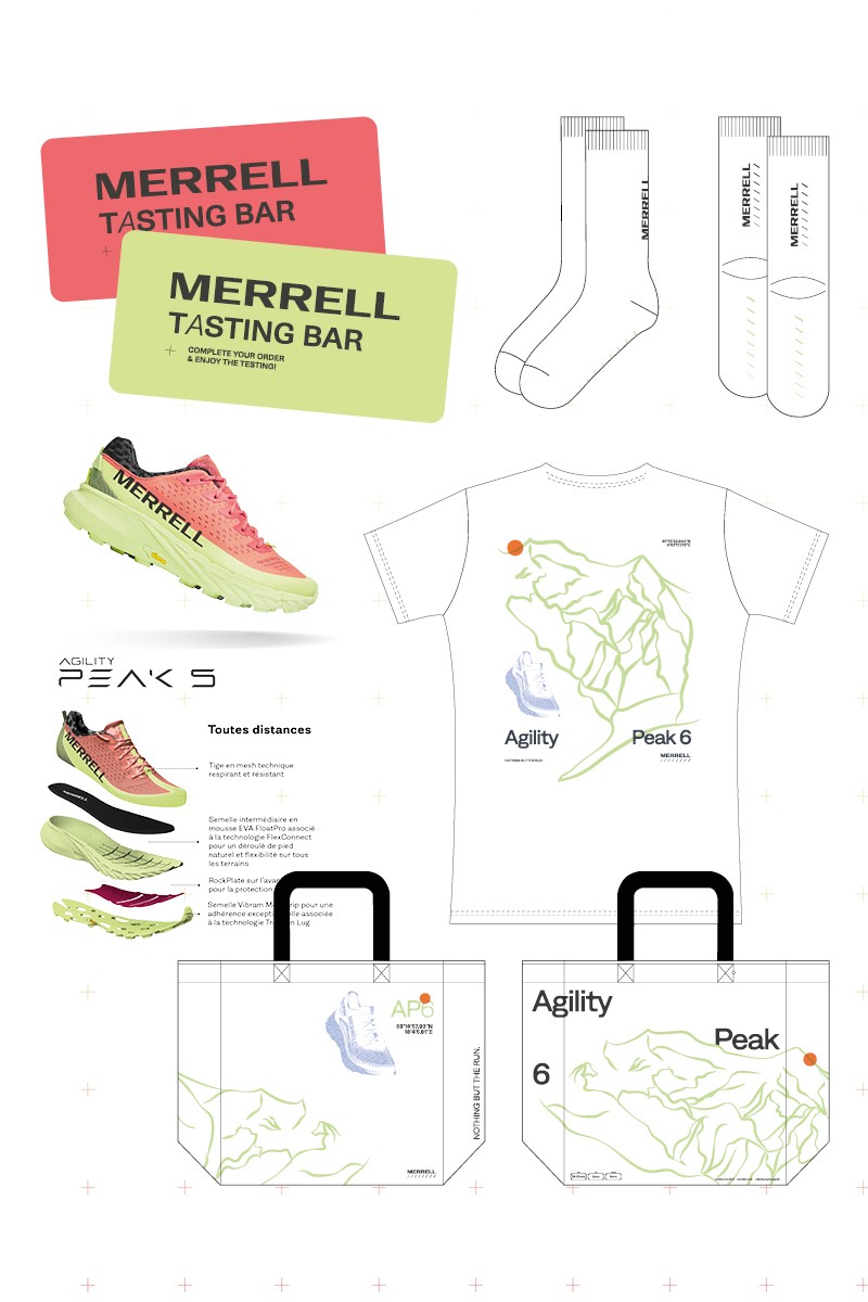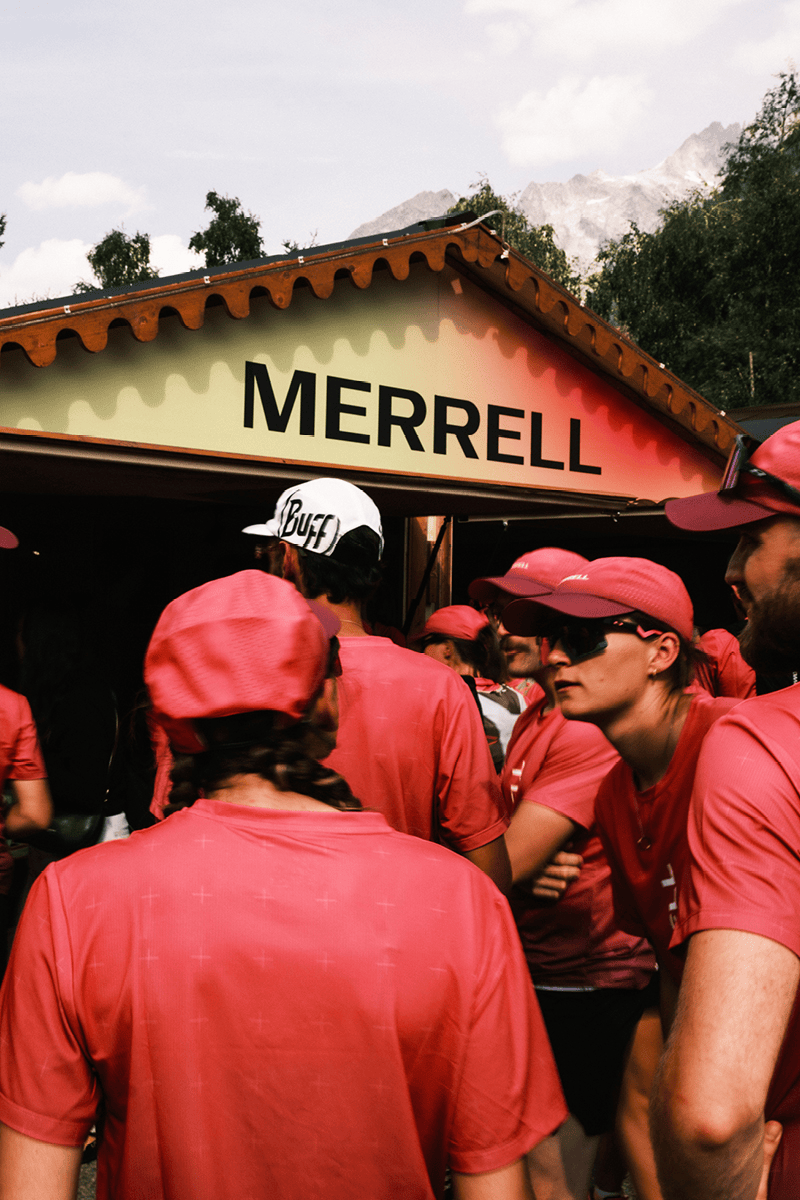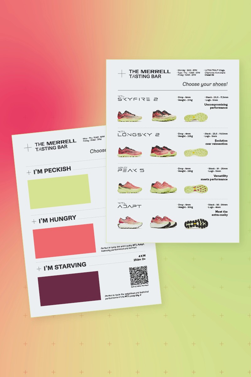 Scénographie, direction artistique et design d’un stand de 27 m² pour les activations B2C de Merrell lors de l’UTMB® 2025 à Chamonix-Mont-Blanc. L’objectif : inviter les visiteur·euses du village à découvrir et tester les modèles Merrell à travers un concept immersif prenant la forme d’un bar à jus, où chaussures et circuit de test s’inscrivent au menu principal. Photos © Outdoor Perspectives - Travail réalisé en tant que DA au sein de l'équipe Outdoor Perspectives