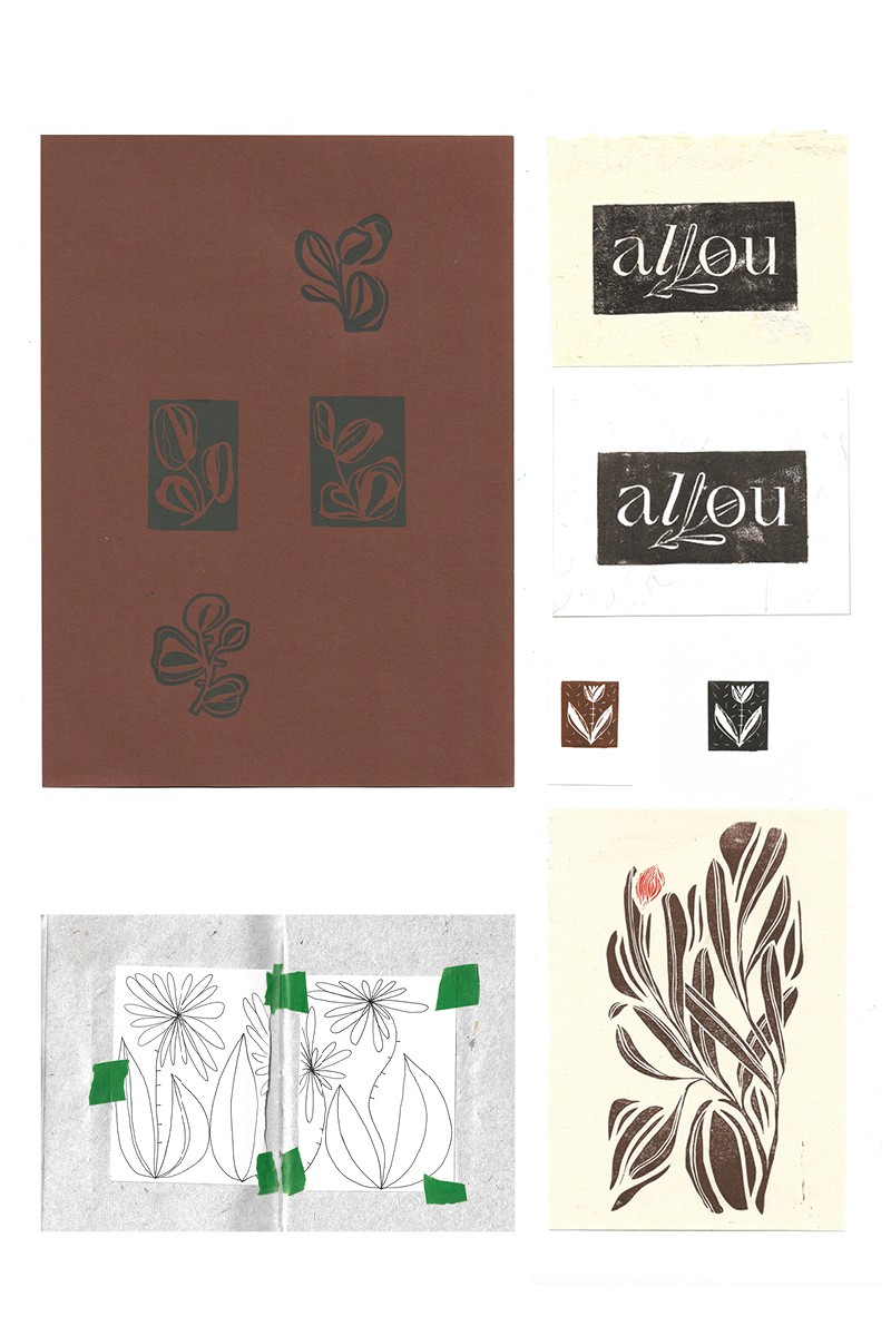 Studio créatif indépendant ― En plus de la gestion de projets indépendants en création graphique, Studio Allou me permet d'explorer ma pratique personnelle. Notamment autour de l'impression artisanale et de la gravure en relief. Voici quelques travaux de recherches visuelles autour de l'organique, du réemploi et du papier.